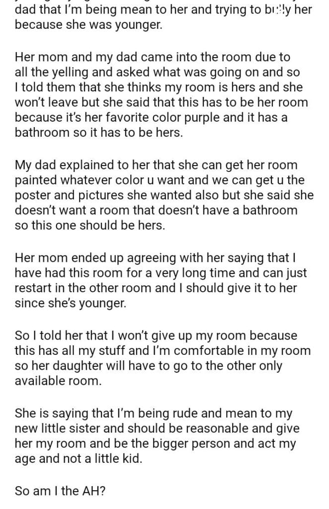 AITA for telling my Stepmom that I won’t give up my room so her daughter can have it?