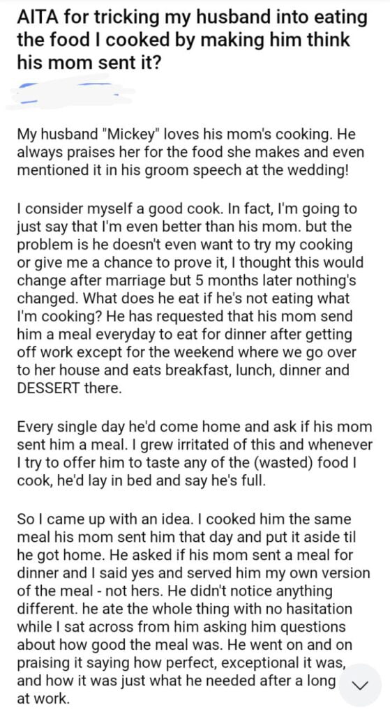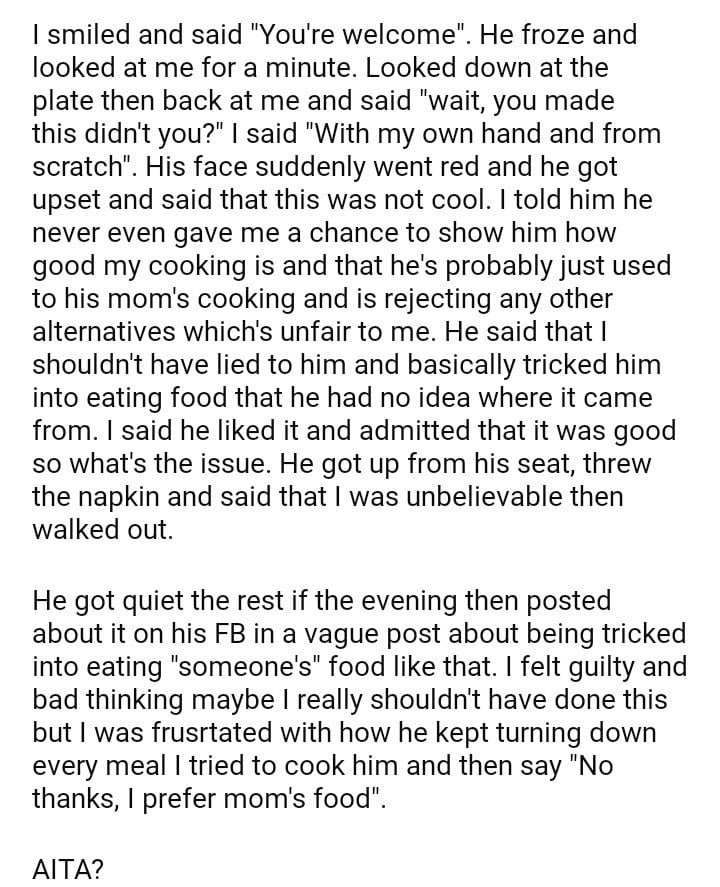 AITA for tricking my husband into eating the food I cooked by making him think his mom sent it?