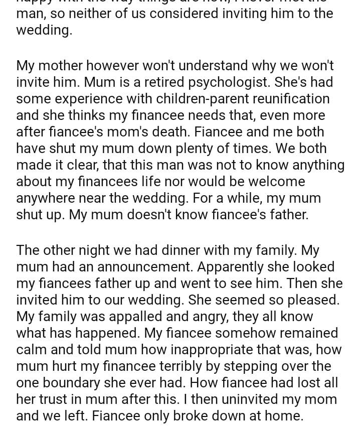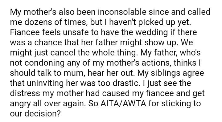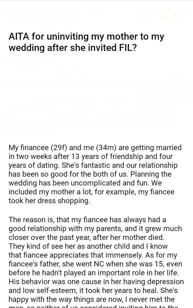 AITA for uninviting my mother to my wedding after she invited FIL?