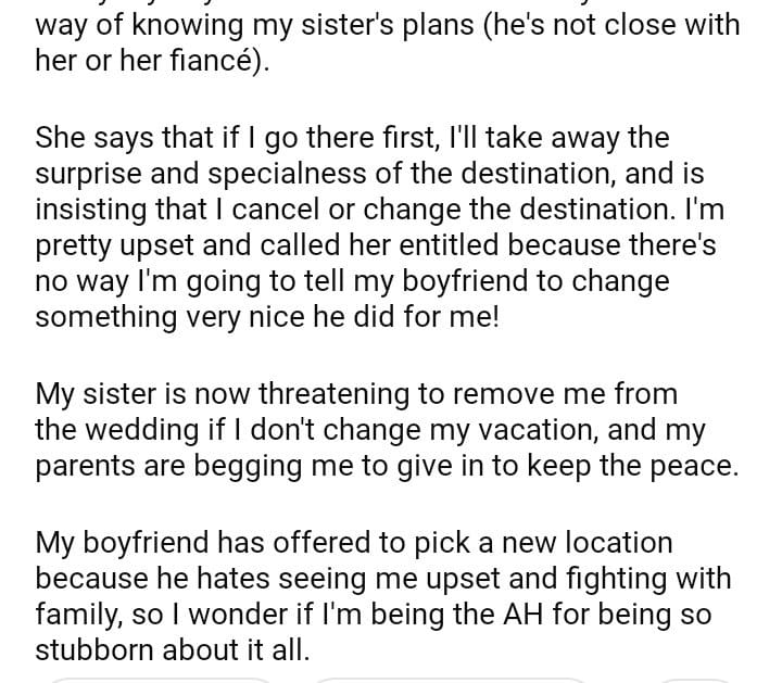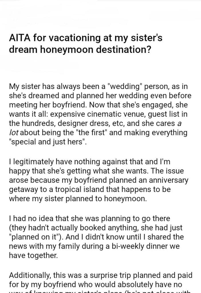 AITA for vacationing at my sister’s dream honeymoon destination?