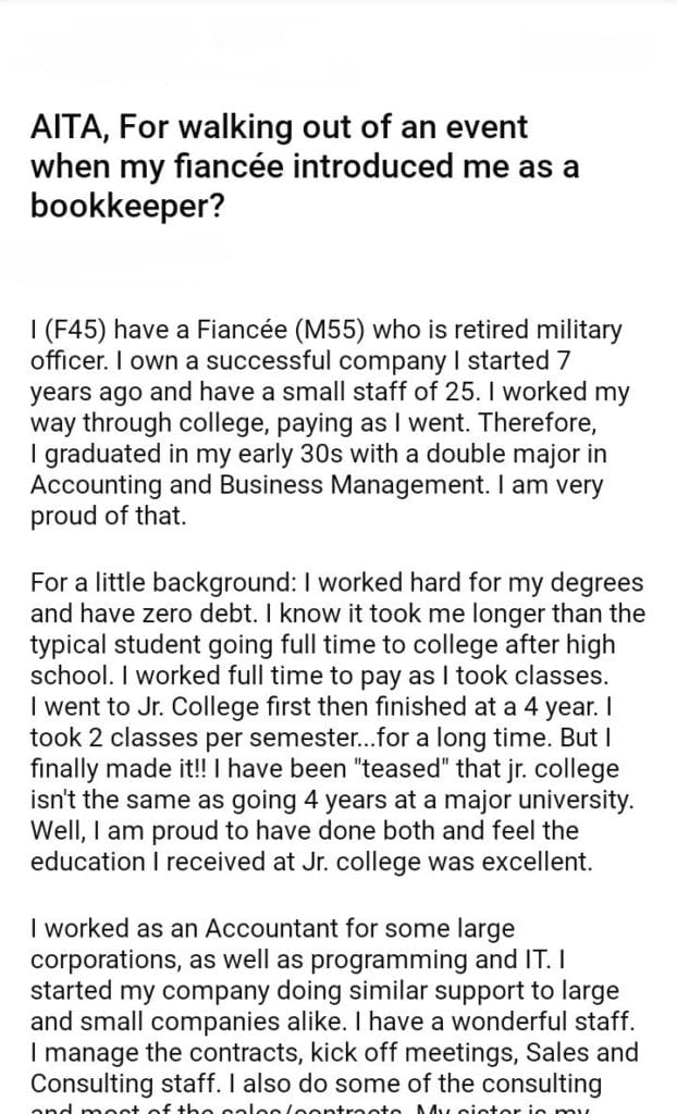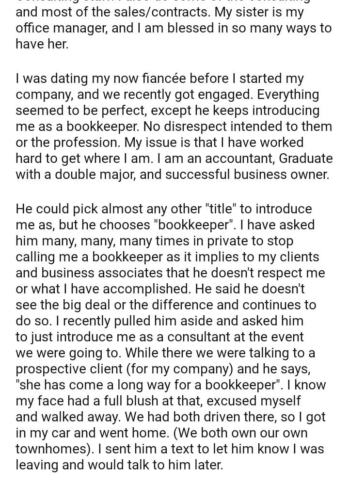 AITA, For walking out when my fiancée introduced me as a bookkeeper?