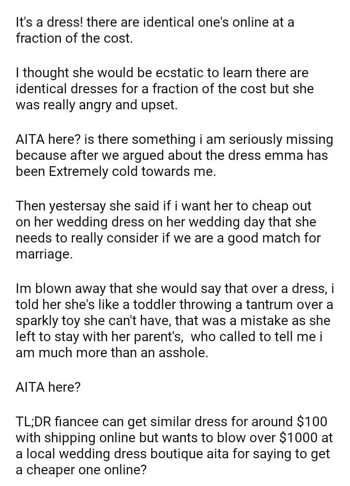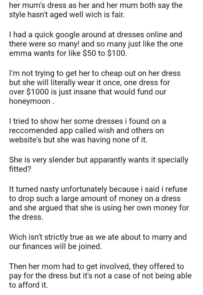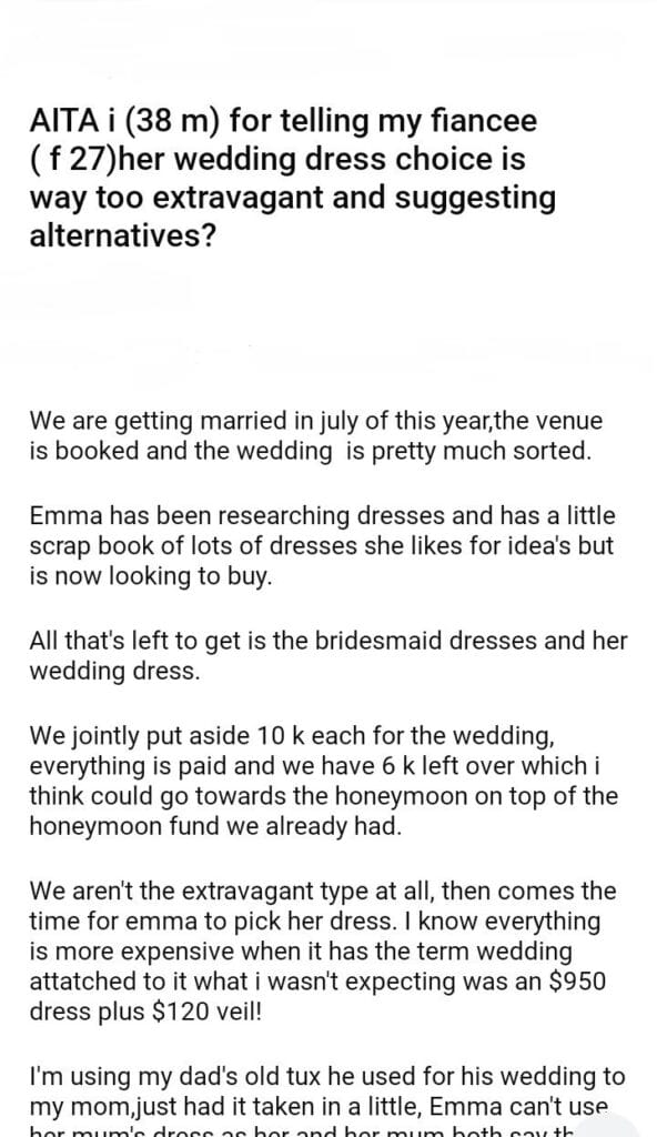 AITA i (38 m) for telling my fiancee ( f 27)her wedding dress choice is way too extravagant