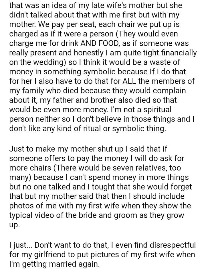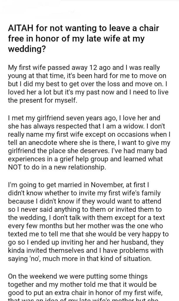AITAH for not wanting to leave a chair free in honor of my late wife at my wedding?