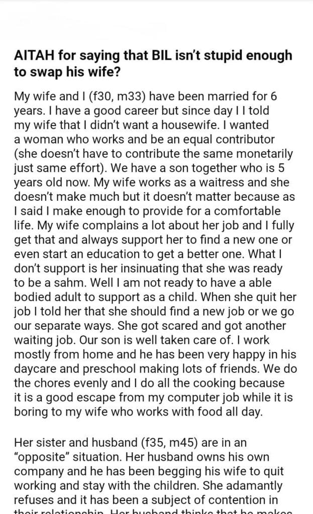AITAH for saying that BIL isn’t enough to swap his wife?