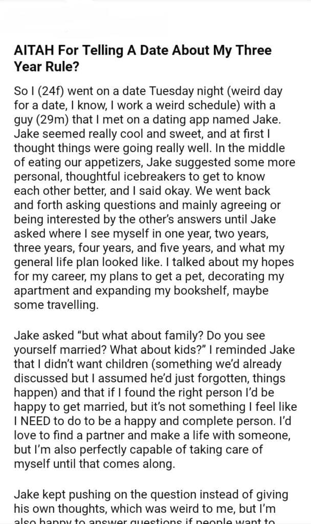 AITAH For Telling A Date About My Three Year Rule?
