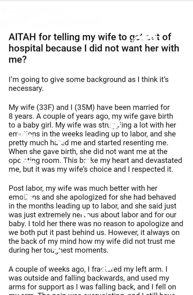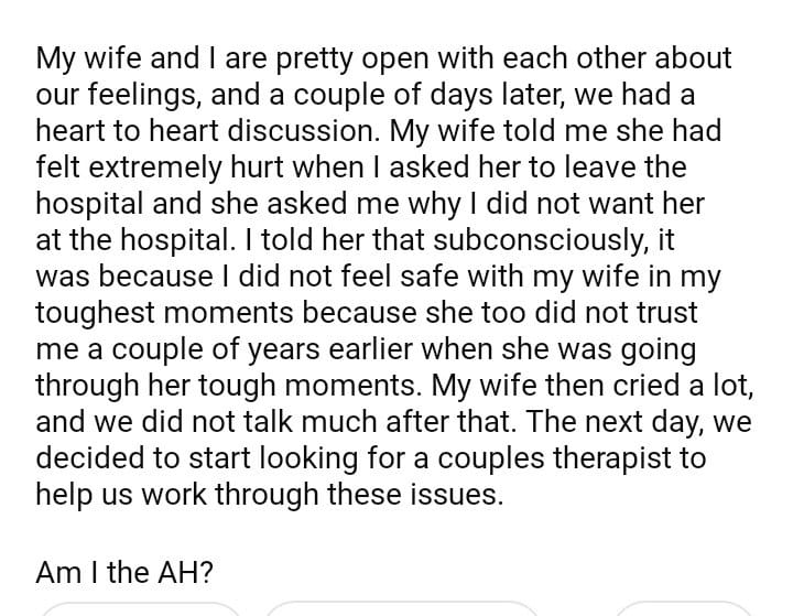 AITAH For Telling My Wife Hospital Because I Did Not Want Her With Me