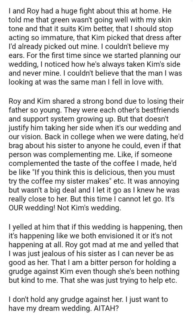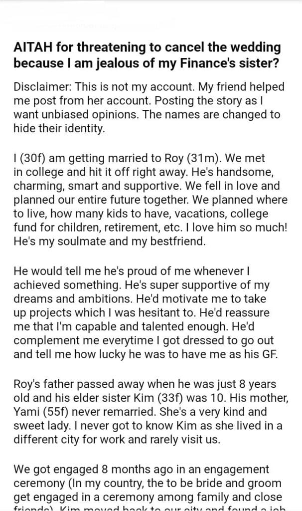 AITAH for wanting to cancel the wedding because of my Finance’s sister?