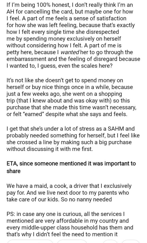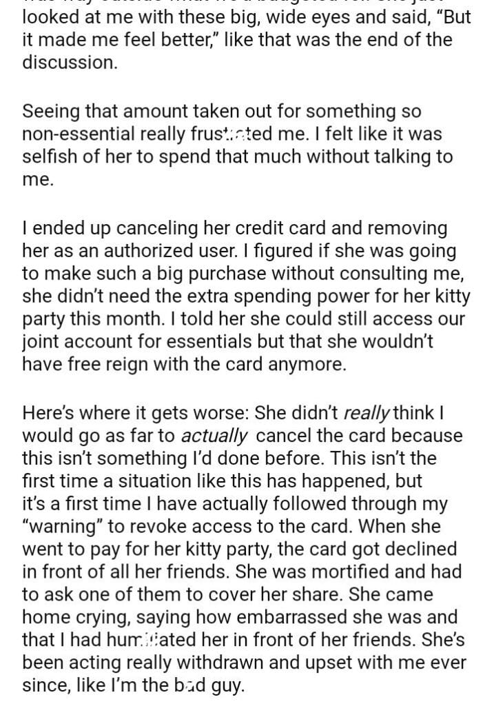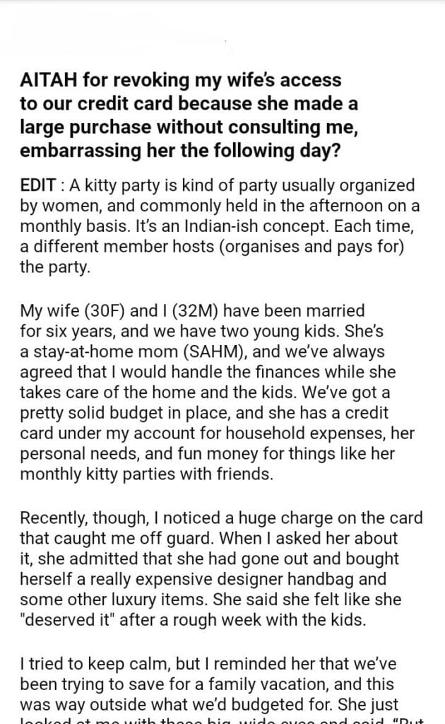 AITAH for wife’s access to our credit because she made a large purchase