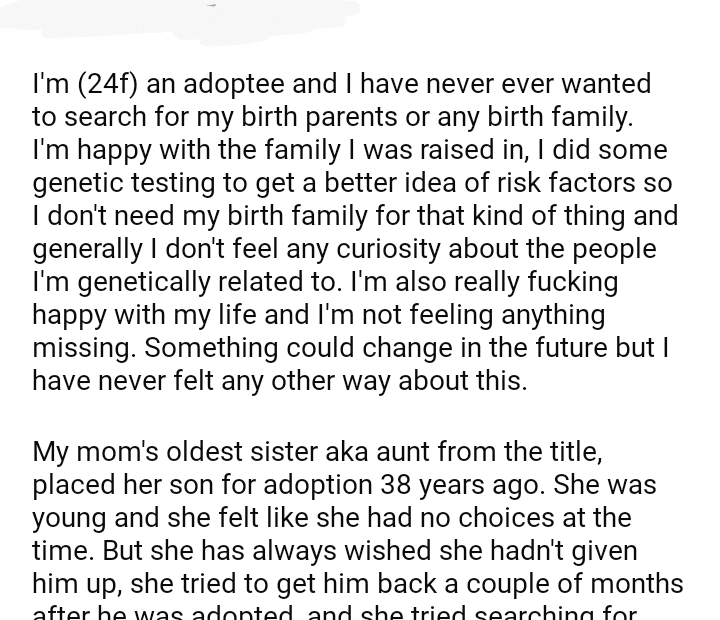 AITA for telling my aunt that finding my birth parents wouldn’t make her bio son search for her?June 4, 2024June 5, 2024AITA