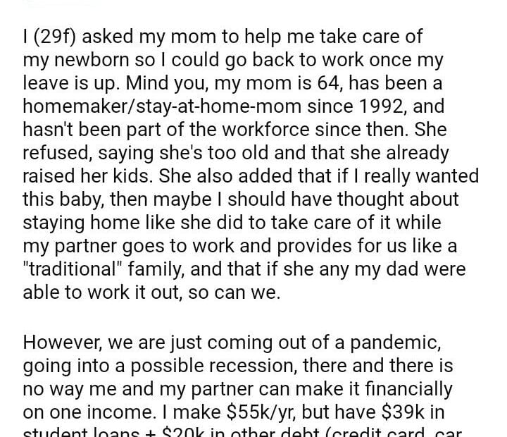AITA if my mom refused to help me take care of my baby while I go back to work?June 1, 2024June 1, 2024AITA
