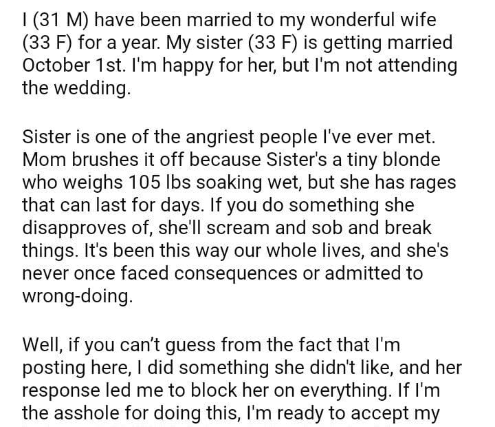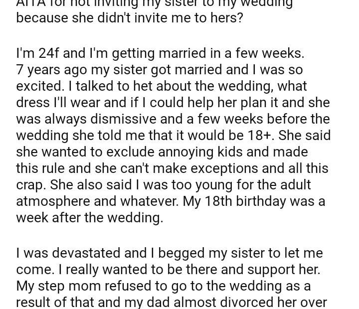 AITAH for not inviting my sister to my wedding because she didn’t invite me to hers?May 29, 2024May 29, 2024AITA