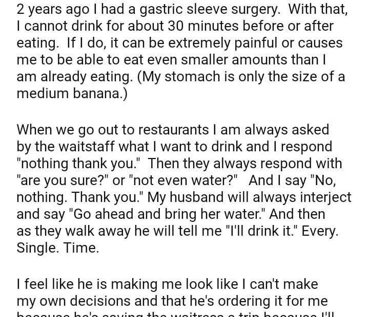 AITAH – My husband keeps ordering me water