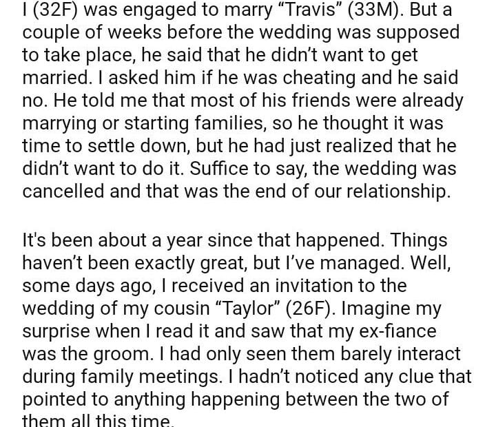 AITA for not attending the wedding of my cousin and my ex-boyfriend?