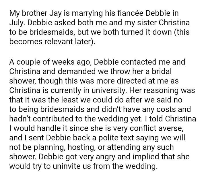AITA for refusing to throw my brother’s fiancée a bridal shower?