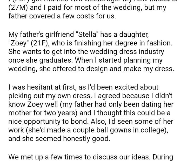 AITA for not wearing the wedding dress my stepsister handmade for me?March 31, 2024March 31, 2024AITA