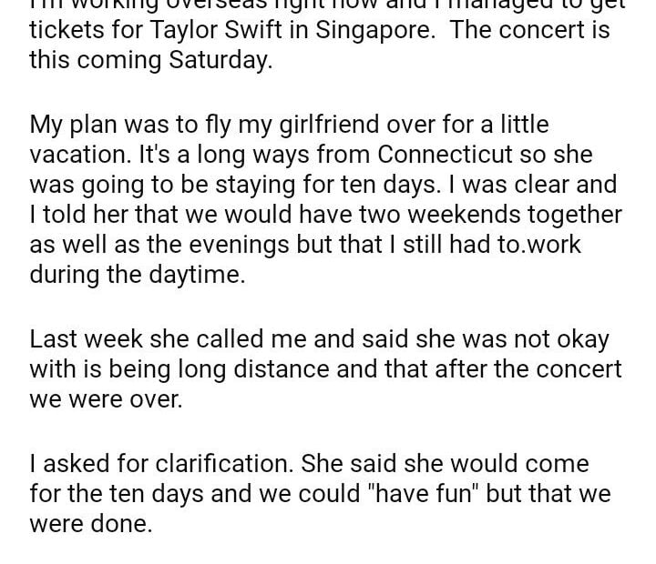AITA for giving my ex girlfriend her ticket for Taylor Swift but cancelling everything else?March 6, 2024March 6, 2024AITA