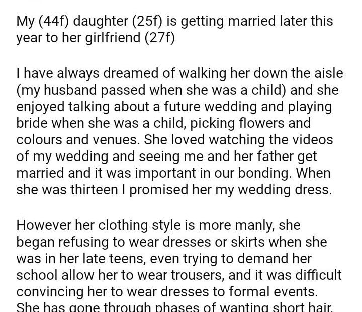AITA for not allowing my daughter to significantly alter my wedding dressMarch 3, 2024April 3, 2025AITA