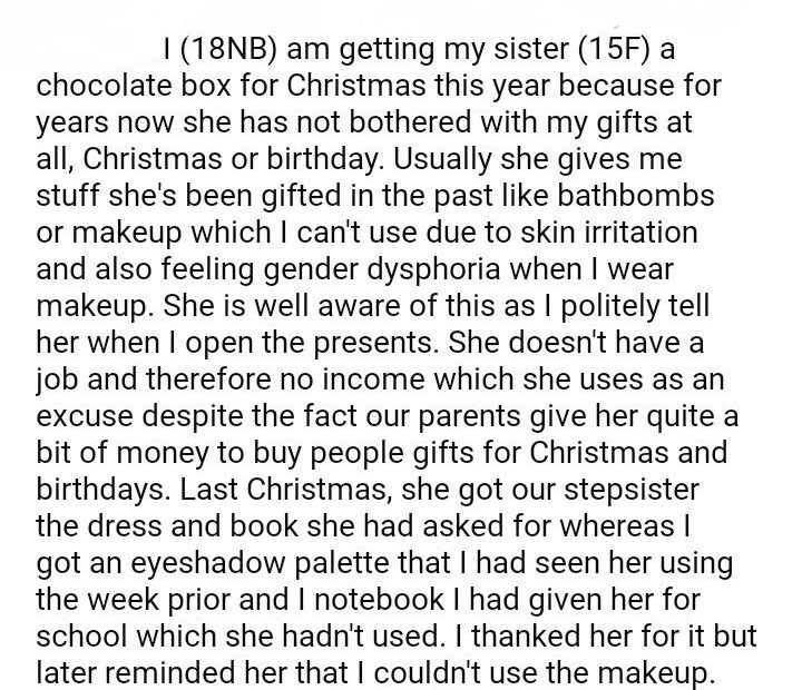 AITA for my sister chocolate for Christmas