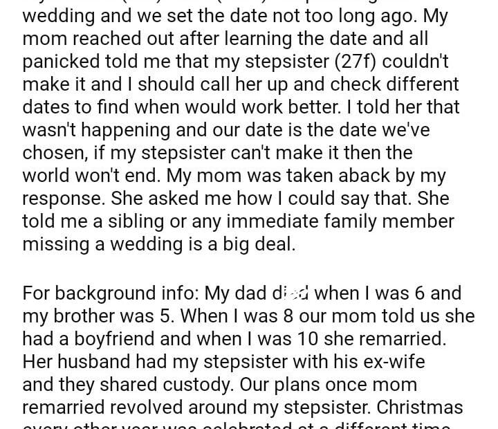 AITA for not planning my wedding around my stepsister’s busy schedule?September 7, 2024September 7, 2024AITA