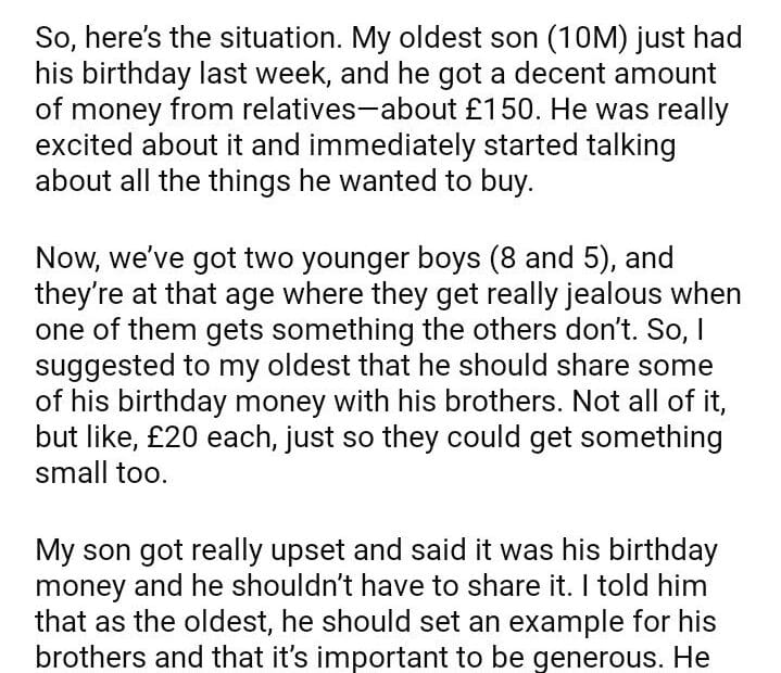 AITA for my son for refusing to share his birthday money with his brothers?August 12, 2024August 12, 2024AITA
