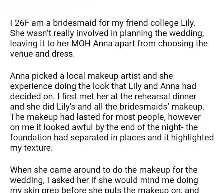 AITA for the makeup artist walking and refusing to cover some of the cost of the MUA?July 26, 2024July 26, 2024AITA