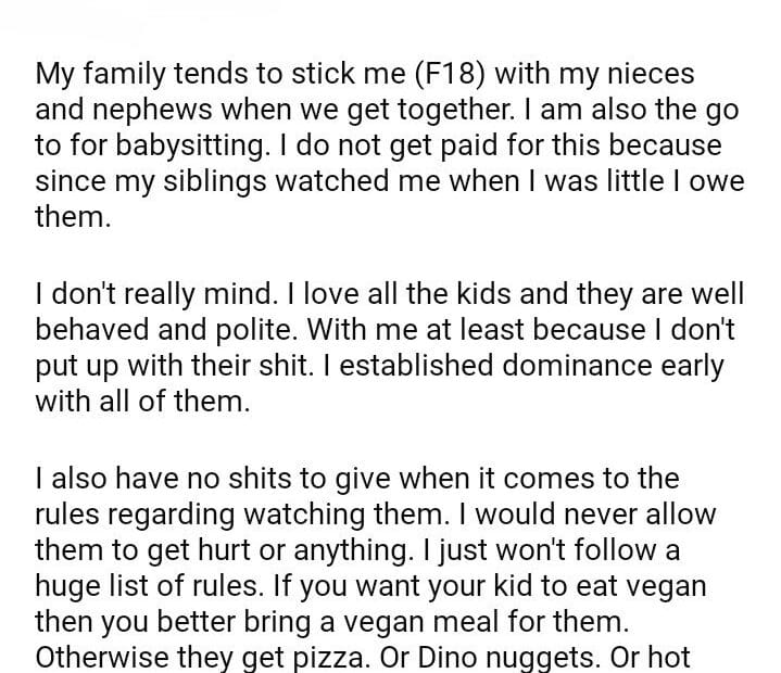 AITA For Telling All My Family That If i’m Babaysitting There Are No RulesJuly 16, 2024July 16, 2024AITA