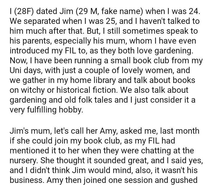 AITAH for letting my ex’s mum into my book club and making his fiancé feel ‘dumb’June 22, 2024June 22, 2024AITA