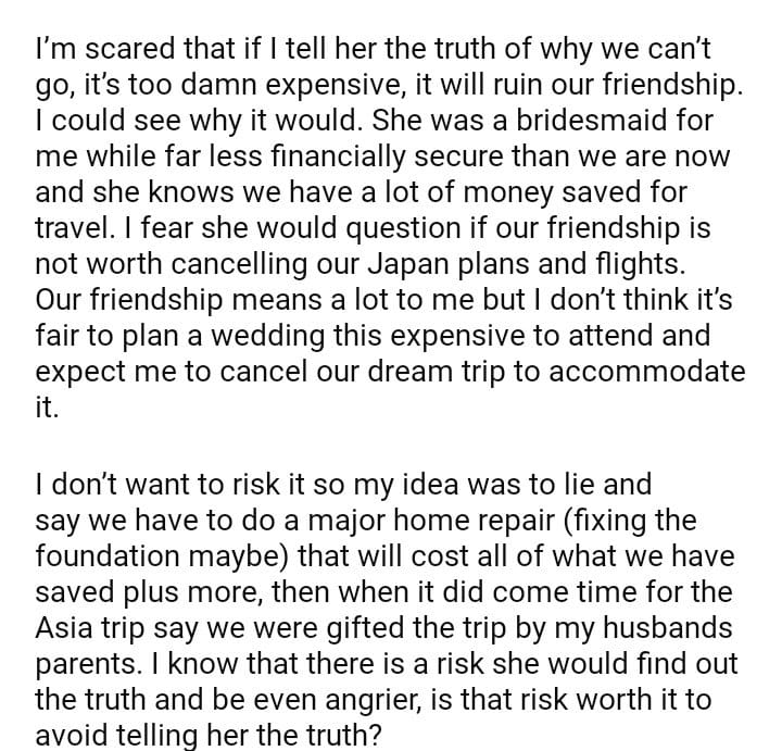 WIBTA For lying about why I don’t want to be a bridesmaid?