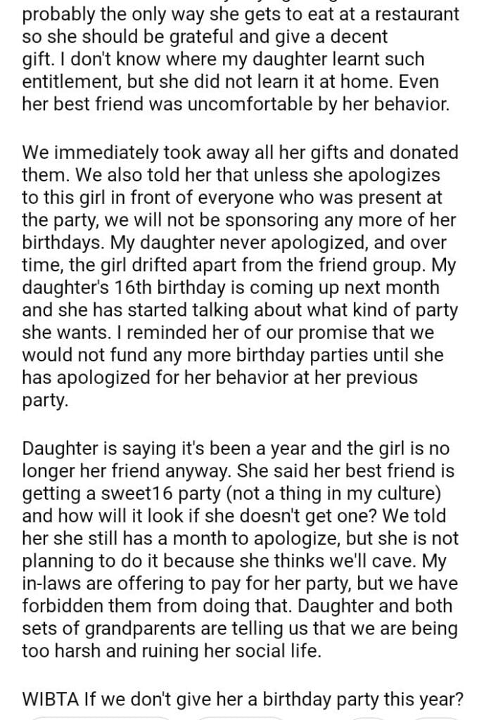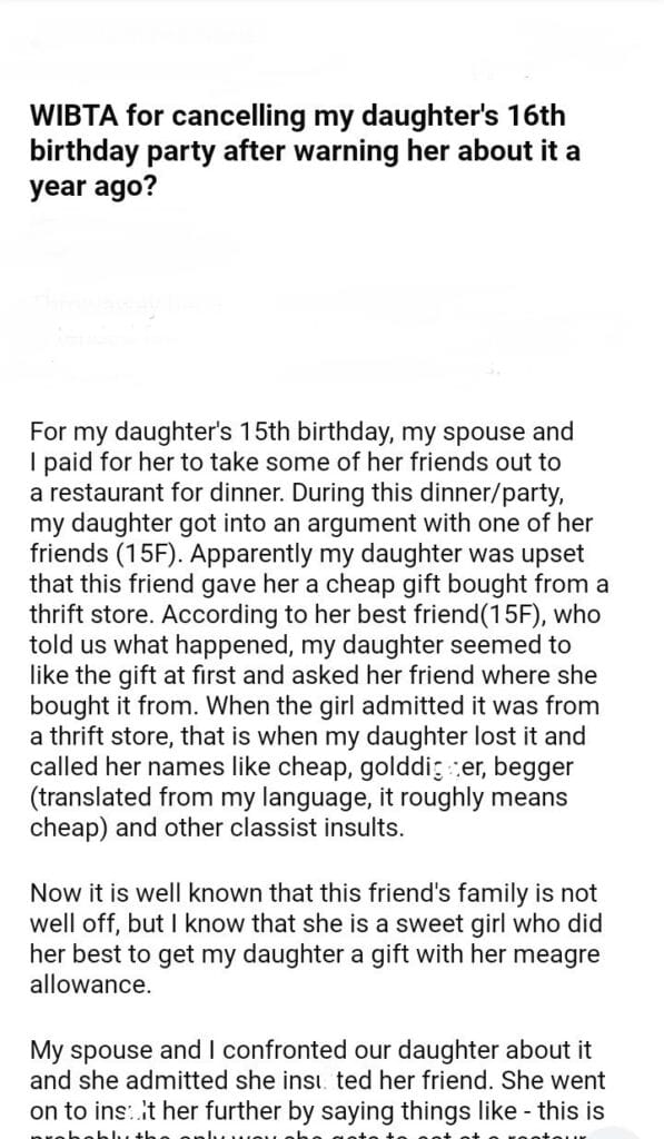 WIBTA for my daughter’s 16th birthday party