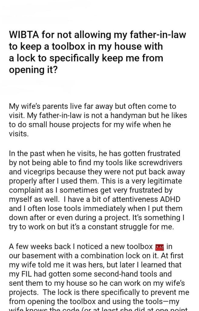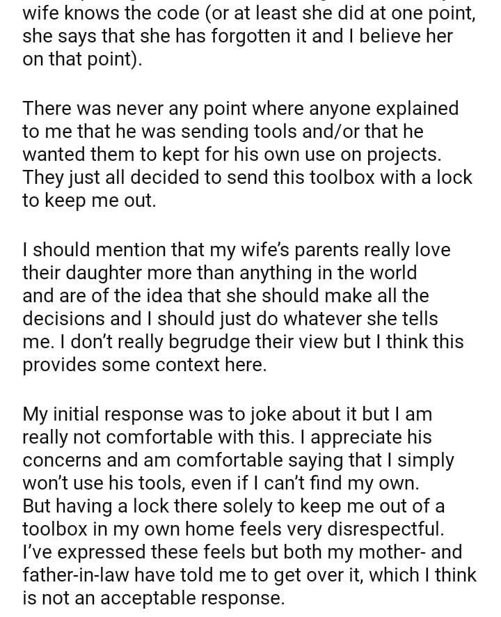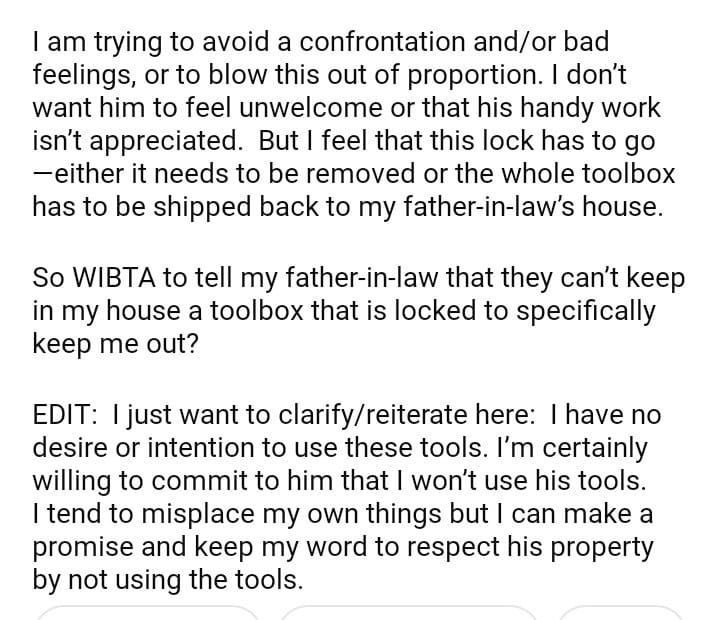 WIBTA for not allowing my father-in-law to keep a toolbox in my house with a lock