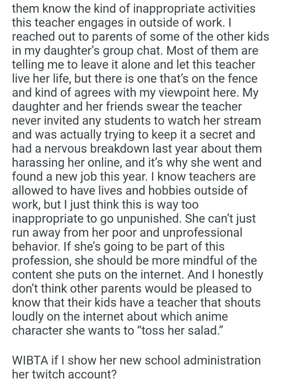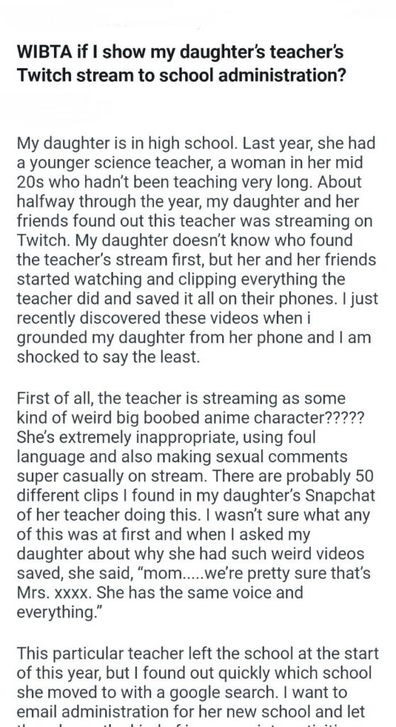WIBTA if I show my daughter’s teacher’s to school administration?
